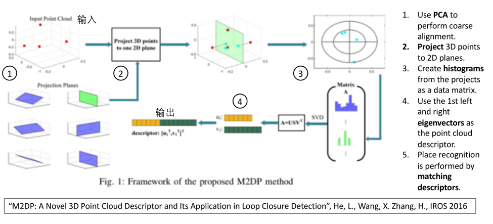 输入是一个点云,输出是向量,该向量描述了点云的特征,产生过程包括若干个步骤。首先把点云投影到几个特定的二维平面,再产生直方图,直方图拼接构成矩阵,通过对矩阵进行奇异值分解 (SVD)计算该矩阵的左右特征向量,最后把两个对应最大奇异值的左右特征向量拼在一起,构成一个一维的向量作为点云的描述符。