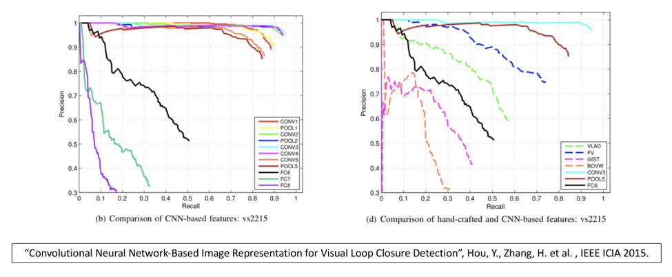 我们在2015年的时候做了这件工作,下图左边是不同的深度神经网络在做图像匹配工作的表现,曲线越高表现越好。右边这幅图介绍了神经网络产生出来的描述符,天蓝色和棕色都是深度神经网络产生的描述符,比传统的手工完成的描述符方法更好,以证明深度学习/深度神经网络是产生全景描述符很好的方法。