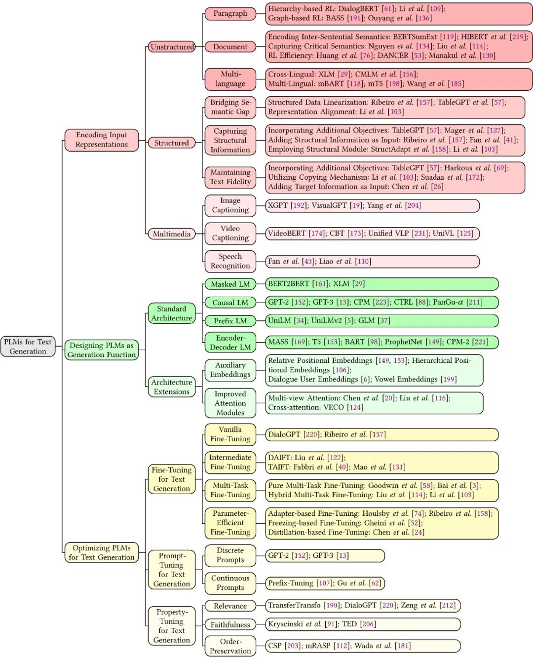 预训练语言模型技术解决文本生成任务主要考虑三个方面的挑战:1)如何有效地编码输入表示并保留其语义?本文第三章对输入数据的形态进行了划分,包括非结构化文本、结构化数据和多媒体数据,梳理了预训练语言模型针对不同类型输入的表示学习方法;2)如何设计有效的预训练语言模型作为生成函数?本文第四章介绍了四种预训练语言模型模式,包括Masked LM,Causal LM, Prefix LM和Encoder-Decoder LM,并在此基础上作出的拓展,例如增加额外的输入Embedding和Attention机制的创新;3)如何有效地优化预训练语言模型并保证输出文本满足某些语言属性?本文第五章介绍了三种针对文本生成任务的优化策略,包括传统的Fine-Tuning技术,新兴的Prompt-Tuning技术,以及针对特殊属性设计的Property-Tuning技术。