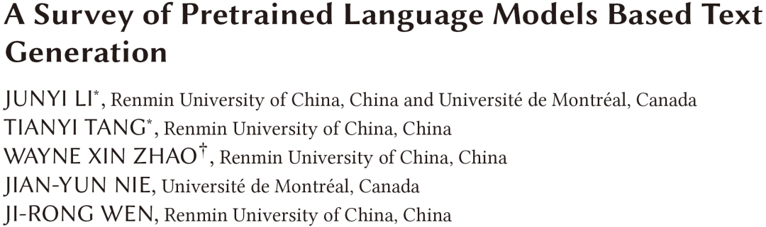 本篇综述“A Survey of Pretrained Language Models Based Text Generation”的第一作者李军毅来自中国人民大学和加拿大蒙特利尔大学,指导教师为赵鑫教授(通讯作者)和聂建云教授。作者从数据、模型和优化方法三个角度切入,主要介绍了近年来预训练语言模型技术在文本生成领域的研究进展,以及相应的挑战和解决方案;然后陆续介绍了预训练语言模型在三个代表性的文本生成任务中的应用,包括机器翻译、文本摘要和对话系统,以及广泛采用的评测基准和评价指标;最后讨论提出了若干个未来的研究方向。本文梳理了2018年至今总计200余篇预训练语言模型研究工作,为后续研究者了解熟悉此领域提供巨大帮助。