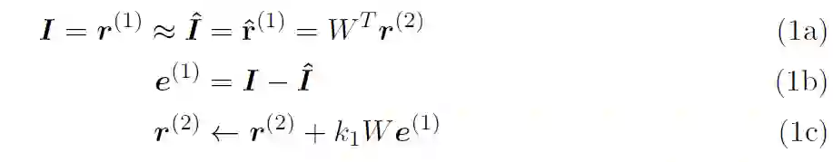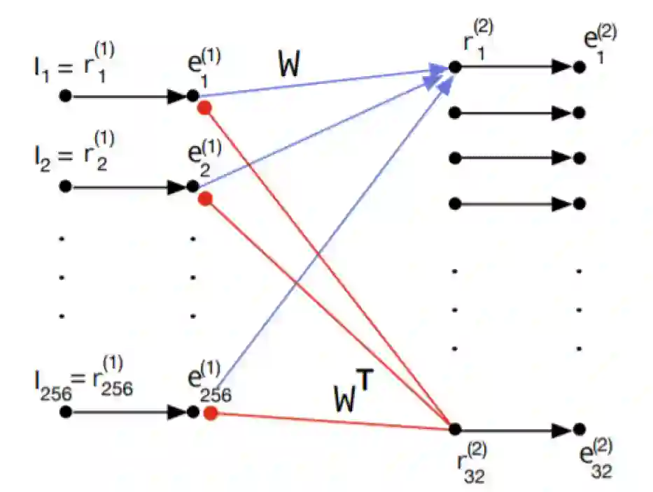图 1(b)抛出了一个尚未有答案的问题:第 r^(l-1)层从第 r^(l+1)层中中获得了什么样的层次表示,这些层次表示与经典的深度学习模型(如卷积网络)中获得的层次表示相比如何?图 2 示出了 [5] 中模型第一层 PE 的网络级表示。为简单起见,假定第 2 层中的表示单元 r^(2)为线性。在接收层 r^(2)中,有两个表示 16x16 大小的图像块的输入像素强度的元素,但只有 32 个表示元素。前馈连接为蓝色 W,反馈连接为红色 W^T。自上而下的预测,表示为 I^。e^(1)单元计算预测误差。这些想法与架构处理有关: