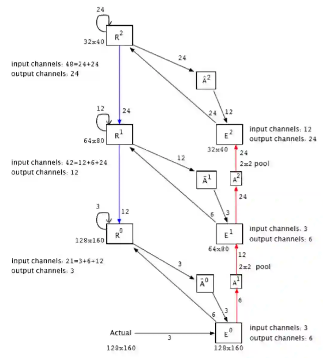 图 8. 扩充后的三层 PredNet 模型,其中,蓝色路线在 RBP 模型中不存在,但在扩充后的模型中使用,红色通路在 RBP 和混合模型中都是缺失的,这是原始 PredNet 模型特有的。箭头附近的标签是通道数。这种结构由表 3 中给出的 Pred1 和 Pred2 模型实现