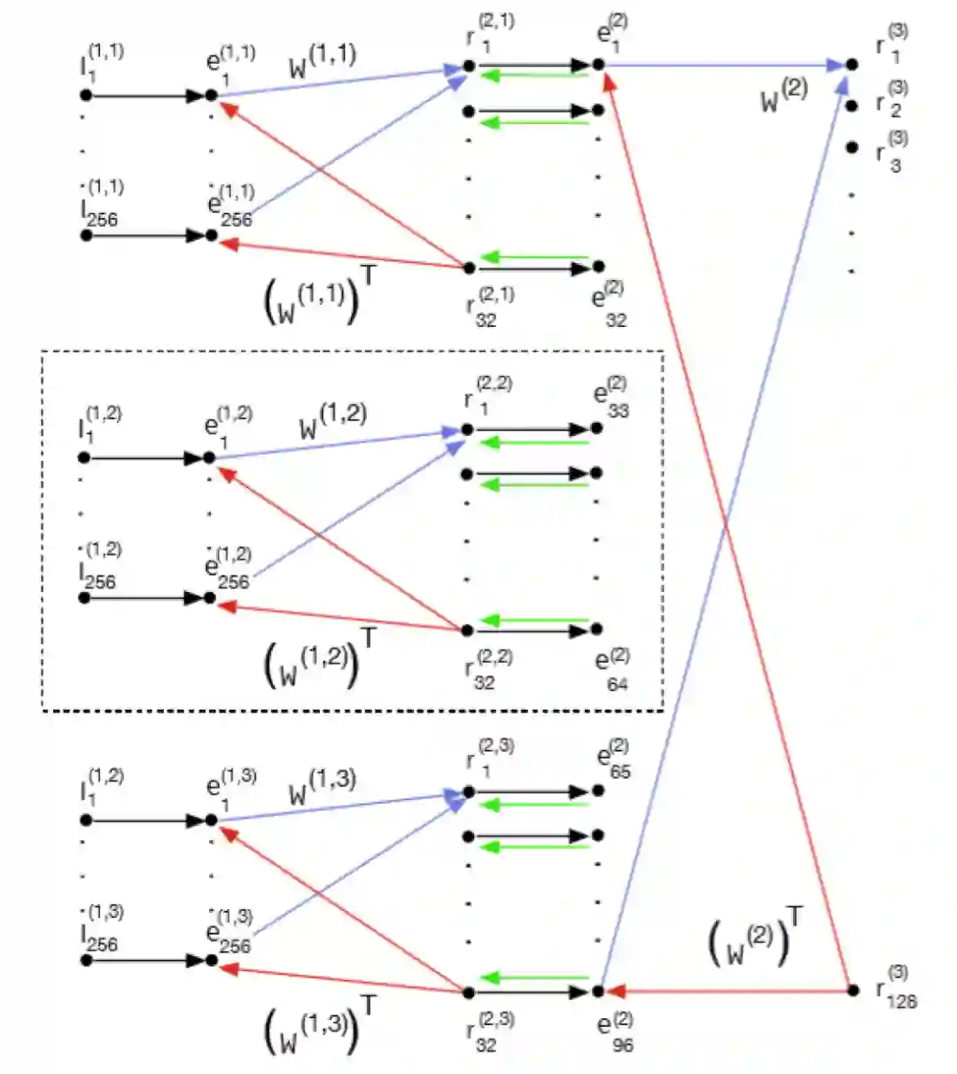 进一步的,给定图 2 中的模块,我们希望看到更大的体系结构是什么样子,以及当它嵌入到上下文层次结构中时会发生什么。为了实现这一点,图 3 扩展了图 2,在第一层中有两个横向 PE,在第二层中增加了一个 PE。层 2 的输入由三个重叠的 16x16 图像块组成。图 2 中的神经元 (r_1)^(1)-(r_1)^(32) 与图 3 中由 (r_1)^(1,2)-(r_1)^(32,2) 识别的神经元相同。新添加的第 3 层接收来自第 1 层的所有 PEs 的输入。在图 3 中,第一层的中间组件对应于图 2 中的模块。