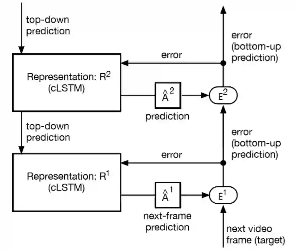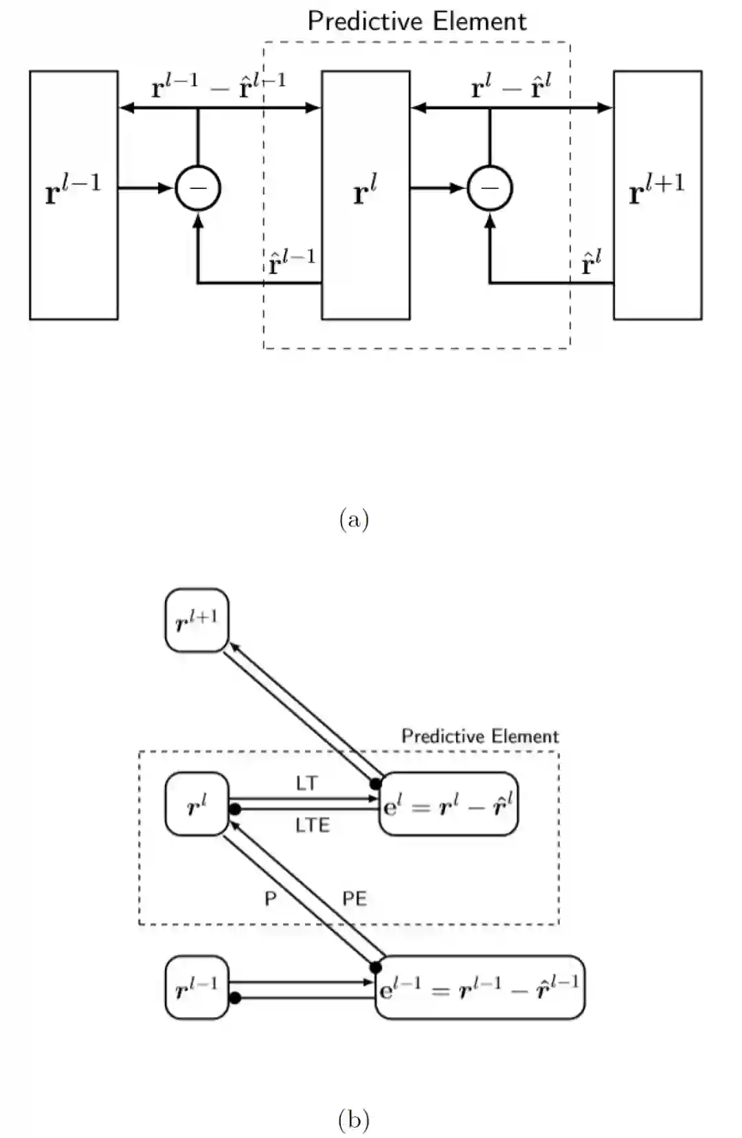 Rao/Ballard 的经典文献 [5] 中使用三级表示层次结构对初级视皮层末梢神经感受野模型进行建模,其中来自更上层的反馈传达对前一层神经活动的预测。例如,将最下层的预测活动与实际活动(原始感官输入)进行比较。预测误差是一个层的输出,并被转发到下一个更高的层。在层次结构中,有两类神经元:内部表示神经元和预测误差神经元。在预测中间层表征时,通过让最上层表征使用相邻的空间上下文对结束停止(End-stopping)进行建模。最上层表征为空间更大的上下文构建表示。该模型是围绕预测元素(predictive element,PE)建立的。人们可以将预测元素视为大脑中的一个处理阶段或皮质层。在深度学习术语中,它由两个执行互补功能的神经层组成,并通过前馈和反馈连接连接。