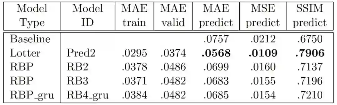 [3] Lotter W , Kreiman G , D Cox. Deep Predictive Coding Networks for Video Prediction and Unsupervised Learning. ICLR 2017. https://arxiv.org/pdf/1605.08104.pdf