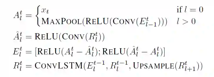 PredNet 架构适用于各种模拟数据,文献 [3] 具体关注图像序列(视频)数据。给定图像序列 x_t,下层的目标设置为实际序列本身,上层的目标则是通过对下层的误差单元进行卷积,然后通过 ReLU 和 Max pooling 处理得到的,使用 LSTM 作为表示神经元。(R_l)^t 利用 (R_l)^(t-1)、(E_l)^(t-1) 更新,以得到(R_l+1)^t。(A_l)^t^ 则通过(R_l)^t 堆的卷积附加 ReLU 处理得到。对于下层,(A_l)^t^ 通过一个设置为最大像素值饱和非线性集: