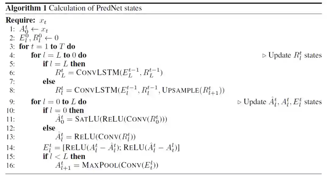 状态更新通过两个过程进行:一个自上而下的过程,其中计算(R_l)^t 状态,然后一个向前的过程,以计算预测、误差和更高级别的目标。最后一个值得注意的细节是 R_l 和 E_l 被初始化为零,这是由于网络的卷积性质,意味着初始预测在空间上是一致的。