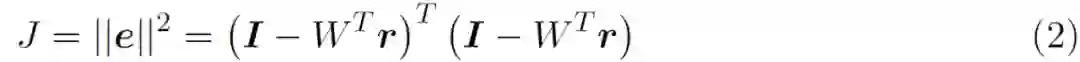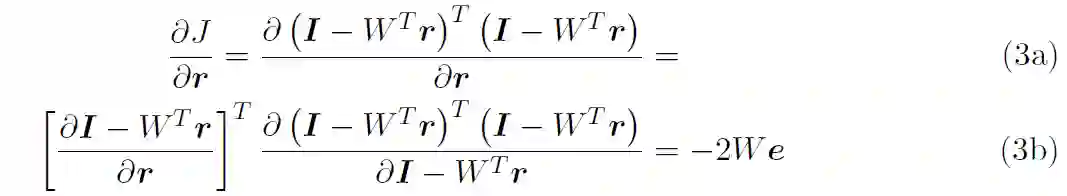 根据公式 (1a),I 是感官输入,第一层表征表示为 r^(1),它们是等同的。I 和 I^ 的维度均为 256 x1(假设为 16 x 16 的输入图像块)。预测输入 I^ 也是等同于 r^(1)。预测输入表示为 W^Tr^(2),其中 r^(2) 的维度为 32 x 1,W 的维度为 32 x 256。最后,在正常工作条件下,输入 I 和预测输入 I^ 应大致相等。公式 (1b) 将第 1 层的预测误差 e^(1)定义为实际输入和预测输入之间的差异。公式 (1c) 用于根据预测误差更新第二层的内部表征。从预测误差平方和的成本函数 J 开始。