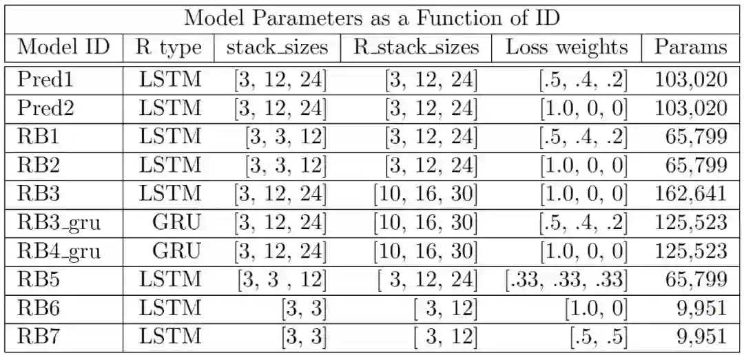 表 3. 根据模型 ID 索引的模型体系结构规范。其中,"stack sizes" 是误差模块的输入通道数,"R stack sizes" 是表示模块的输出通道的数量,"Params" 是模型中可训练参数的数量
