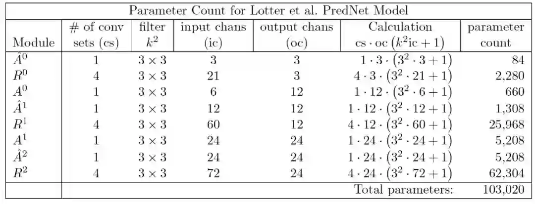 接下来,作者将图 7 中的 RBP 模型与原始 PredNet 3 层模型进行比较。两个模型都使用相同的 11 个模块。两种模式都被限制在 R^l 模块中使用相同的输出通道。为了将这些模块组合在一起,要求 Rl^ 模块的输入通道数不同,E^1 和 E^2 模块以及连接它们的 A^l 和(A^l)^ 模块的通道数也不同。由于输入通道的数量不同,图 8 模型有 103,020 个参数(参见表 2),而不是 65,799。图 7 和图 8 中连接模块的箭头表示信息流的方向。箭头上的数字标签表示该路径的通道数。每个模型的 R^l 模块中的输出通道数量是匹配的。