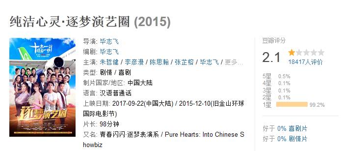 最近由北大博士导演毕志飞执导的电影《纯洁心灵·逐梦演艺圈》自9月22日全国上映后,在豆瓣上的评分仅仅只有2分。有网友称,这部电影可能会成为“豆瓣评分最低电影之一”。