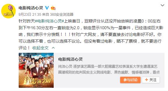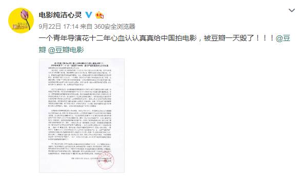 9月22日,而获得极低评分后,该电影官方微博帐号“电影纯洁心灵”在微博发函表示愤慨并要求豆瓣道歉:“一个青年导演花十二年心血认认真真给中国拍电影,被豆瓣一天毁了!!!”