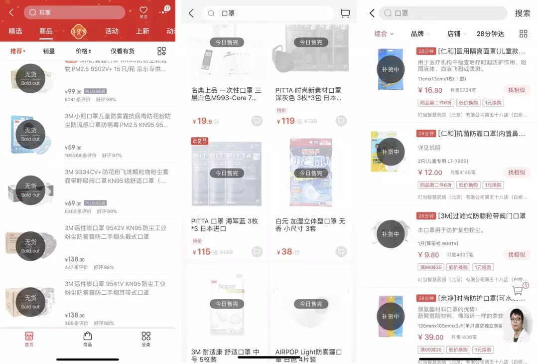 燃财经发现,从1月20日开始,淘宝天猫、京东、拼多多等多个电商平台,美团、盒马鲜生、叮当快药等售卖口罩的O2O平台都“宣布”口罩告急,特别是3M品牌旗舰店内主打防霾、防粉尘、防病毒的KN95系列口罩大多处于“售罄”、“无货”状态。