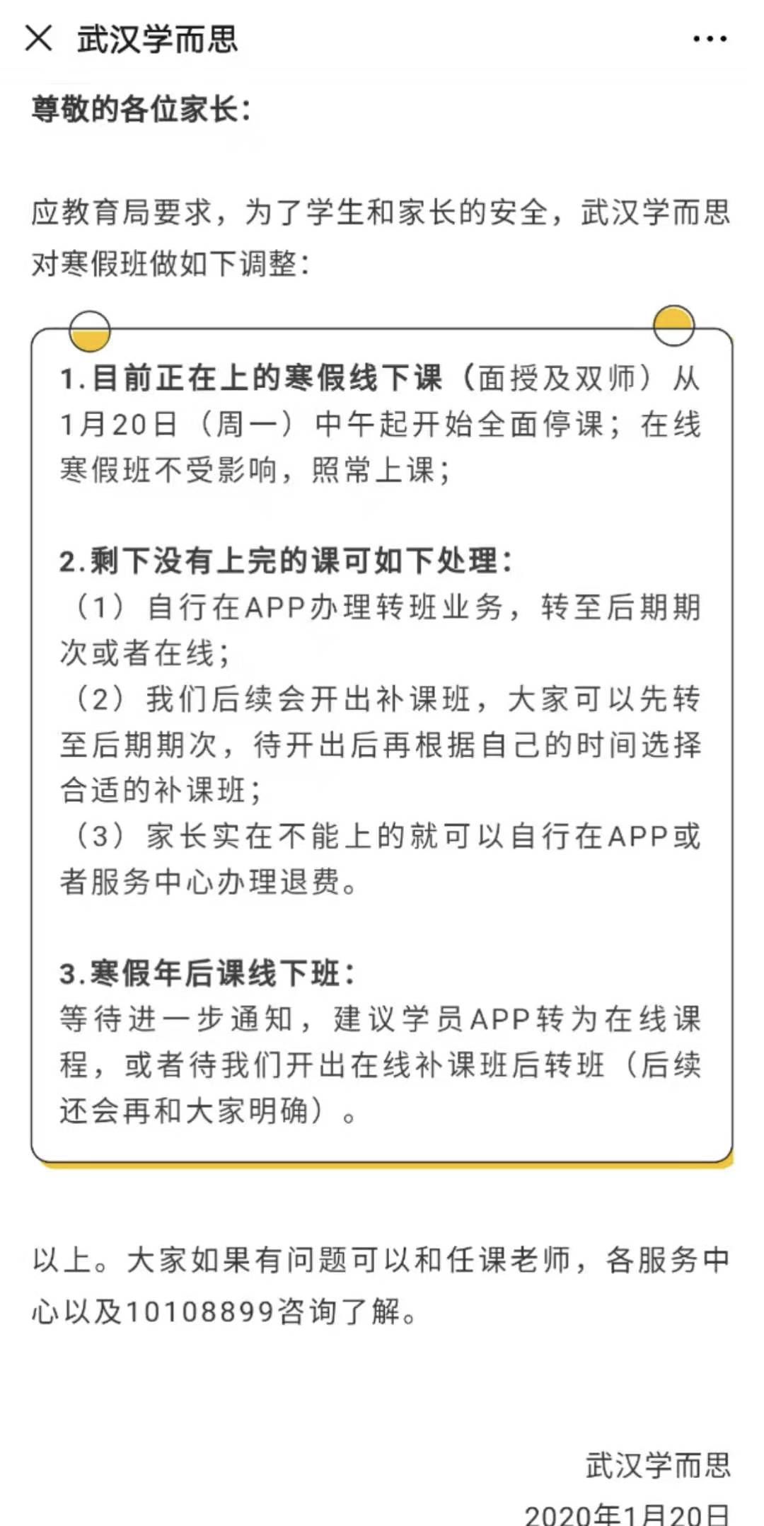 1月20日,网上有消息称好未来旗下的”学而思“发现一例学员感染新型肺炎,武汉学而思官方称纯属谣言,并表示武汉学而思已从20日中午开始全面停课,建议学生转至后期期次或在线上课。