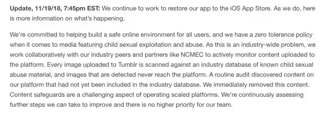 最初Tumblr只是说它“遇到了一些问题”,“正在积极解决”。然而随后 Tumblr 在网站公开的信息显示,这次应用被下架和儿童色情直接相关。