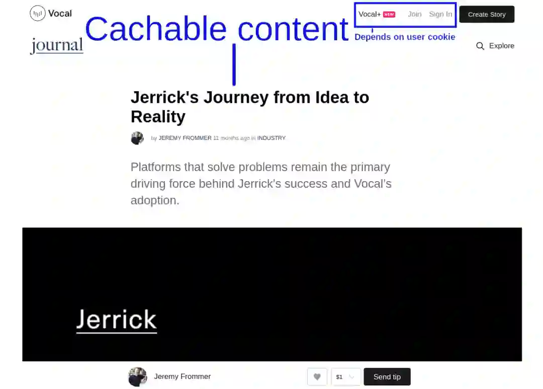 这种技巧不仅可以提高缓存命中率,而且还能帮助改善人们心理上感知的页面加载时间。黑屏甚至载入动画都会让我们感到不耐烦,但一旦出现第一块内容,它就会让我们分心数百毫秒。如果人们点击社交媒体上的 Vocal 帖子链接,而主要内容立即从 CDN 发送过来,那么很少有人会注意到,直到几百毫秒之后某些组件才能完全互动。