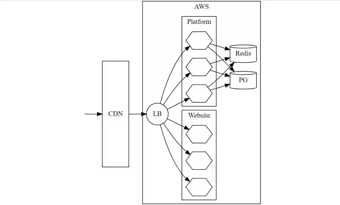 Vocal V2 的架构。请求通过 CDN 到达 AWS 中的一个负载均衡器。负载均衡器将流量分配给两个应用,“Platform”和“Website”。“Platform”是一个 Keystone 应用,负责在 Redis 和 Postgres 中存储数据。