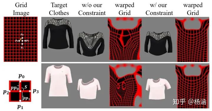 在Clothes Warping Module里面,我们使用Spatial Transformation Network (STN) 利用薄板样条插值算法(TPS)对目标衣服进行变形,以保留衣服的纹理细节。但是,仅仅使用现有结构不足以保留精确的纹理细节,尤其是面对复杂姿势、复杂衣服花纹的时候,更容易出现不匹配的情况。为了解决这一问题,我们引入一种二阶差分约束,对TPS变换中的网格点进行控制。
