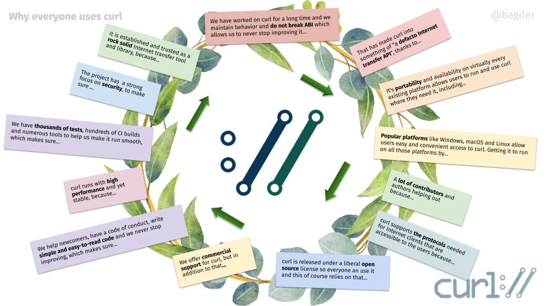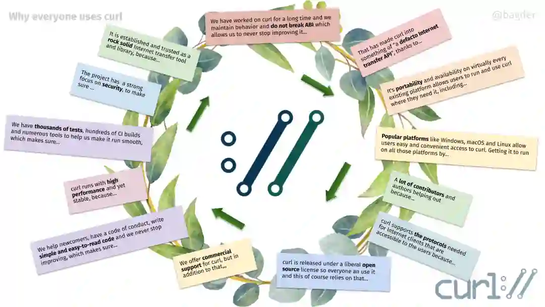 我相信,差不多每个使用 curl 的人都有自己的故事和解释,为什么他们在自己的产品或设备中使用 curl。为什么用户,包括许多世界上最大、最成功的科技巨头,认定他们可以依靠 curl 进行互联网传输,我认为有几个很好的理由。
