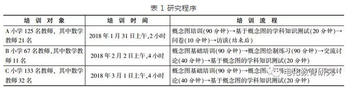 本研究选取了来自陕西省西安市三所小学的数学教师为研究对象。由于大部分教师对概念图比较陌生,本研究基于这三所学校组织的以概念图为主题的校本培训进行。研究程序见表1。