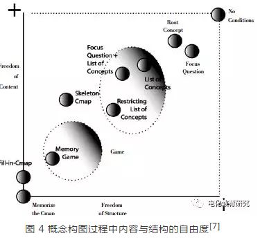 上述结果可以从三种概念构图任务重点考察的知识类型和范围得到解释和验证。Canas等人从内容自由度和结构自由度两个维度对各种概念构图任务进行了分析(如图4所示)[7],比较极端的是背诵概念图(Memorize the Map)和不设置任何条件的概念构图(No Conditions),前者既无内容自由度也无结构自由度,属于典型的机械学习活动;后者没有任何限制,但没有任何可操作性。本研究中采用的三种概念构图活动中,“填充概念图”(Fill-in-Cmap)的自由度最低,构图者在结构上没有任何施展空间,在内容上可以发挥的地方也很小。在这类任务中,概念填充考察的是对一个知识网络中个别概念的回想能力,连接词填充考察的是对概念间关系的理解,以此来评价教师的结构化知识明显是无效的;“基于核心概念构图(List of Concepts)”的自由度处于中间位置,一方面部分核心概念已给出,构图者可以在此基础上自行添加一部分概念,另一方面构图者可以自行安排概念图的结构,因而此类任务主要考察的是对于这些给定概念间关系的理解情况;“基于焦点问题构图(Focus Question)”的自由度最高,构图者需要根据焦点问题联想相关概念、组织概念层次关系并建立概念间关系。与“基于核心概念构图”相比,“基于焦点问题构图”自由度更高,但同时焦点问题也为构图者设定了思考的方向,使得构图时也更有针对性。