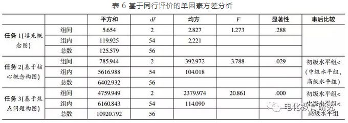 为了优化基于概念图的学科知识评价任务设计,我们以同行评价为分组依据,采用单因素方差分析研究三种类型的概念构图任务对三组教师的区分度。结果发现,三组教师在任务1上的表现无显著差异(p=.288),在任务2上有显著差异(p=.029),在任务3上有极其显著差异(p=.000)。事后比较发现,中级水平组和高级水平组教师在任务2上的表现无显著差异,三组教师在任务3上的表现均有显著差异(见表6)。