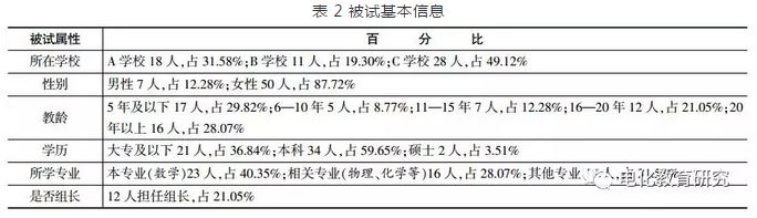 培训中面向数学教师发放基于概念图的学科知识评价任务,共发放测试卷64份(A校21份,B校11份,C校32份),有效回收57份(A校18份,B校11份,C校28份),有效率89.1%。有效被试基本信息见表2。