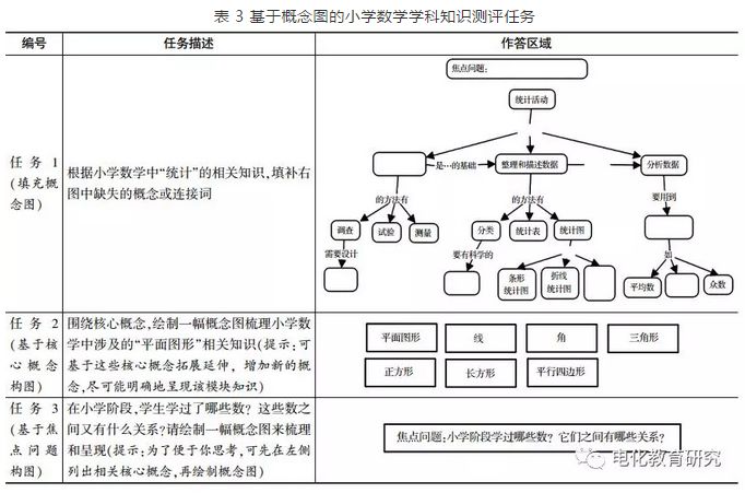 通过访谈了解到,小学数学教师在具体知识点上普遍掌握得很好,但在单元知识结构、主题板块知识结构以及具体知识点在整个学科框架中所处的位置方面存在显著的认知差异,因而概念图比较适合考察教师对单元知识结构、主题板块知识结构的把握;任务设计方面,专家们认为,小学数学教师对概念图比较陌生,评价实施前需要开展概念图培训或者在测评任务中提供有效范例,要求教师完成的概念图数量最好在3个左右,并且应该考察不同模块的知识以求评价的全面客观;在任务形式上,可将自由绘制、关键词绘制、填充概念图等多种形式并用,由易到难,从而检测到教师的真实水平。