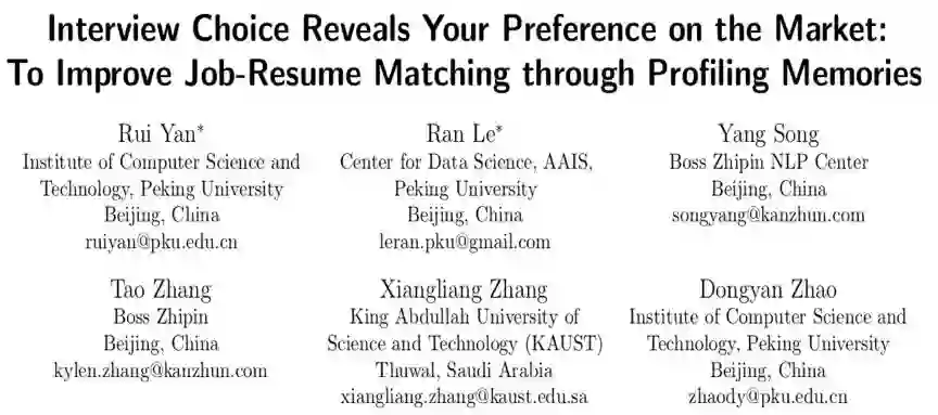 针对互联网求职招聘场景的人岗匹配推荐问题,北大联合 BOSS 直聘的研究者们提出了一种建模求职者与招聘者双方偏好的新型深度文本匹配模型。该模型通过引入记忆模块,利用简历文档和岗位描述文档之间的信息交互来学习潜在偏好表示,并将偏好结合到匹配框架中构建端到端的深度神经网络模型。基于在线招聘平台 BOSS 直聘数据集的实验结果表明,本文提出的模型效果超过 state-of-the-art 的人岗匹配推荐方法,各评价指标均有显著提升。实验证明,互联网招聘场景中的求职者与招聘者双方确实存在历史行为偏好,并且该偏好可以用来改善人岗匹配推荐系统。目前,该论文已被数据挖掘领域顶会 KDD2019 接收。