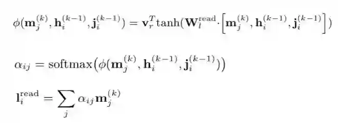 记忆模块读取:在每轮迭代的记忆模块更新操作后,岗位描述文档的各个带上下文信息的句子向量表示从记忆模块中读取偏好信息。读取操作采用与更新操作中相似的『注意力机制』来计算偏好信息向量。