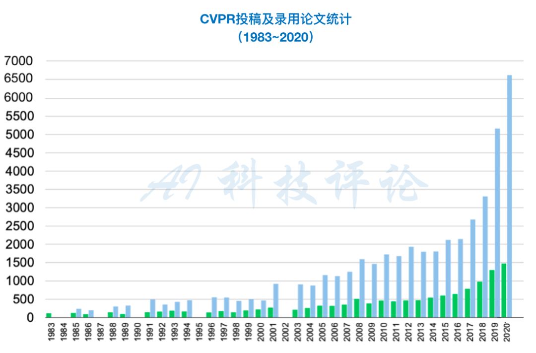 虽然在近三年来,CVPR 的论文投稿量都在持续大涨(CVPR 2018有 3300 篇有效投稿、CVPR 2019有 5160 篇有效投稿、CVPR 2020有效投稿达6656),然而在接收率方面,已是“二连降”(CVPR 2018 收录论文 979 篇、接收率为 29%左右;CVPR 2019 收录论文 1300 篇,接收率为25%左右;CVPR 2020 收录论文 1470篇、接收率为 22%左右)。