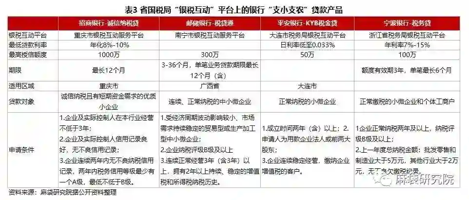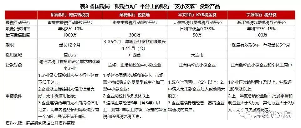 据麻袋研究院了解,目前“银税互动”的模式有两种,一种是由税务局自建平台与银行合作,针对性地对当地小微企业提供信贷服务,如上海银税互动信息服务平台、福建省税务局银税互动平台等。以上海银税互动信息服务平台为例,据麻袋研究院了解,该平台自2017年4月上线以来,入驻金融机构60家,授信企业2604家,累计授信额度35.59亿元。