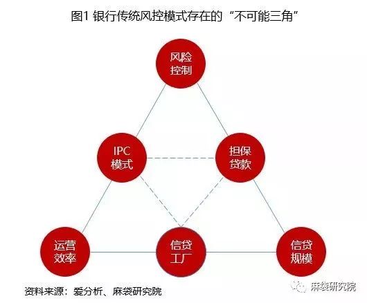 以往银行开展小微企业贷款的风控模式主要为担保模式、IPC模式和信贷工厂模式三种。小微企业往往存在财务制度不健全、信用等级偏低和缺少抵押、担保等第二还款来源的问题。IPC模式重视实地调查和信息验证,在客户获取、客户服务方面具备优势,但容易产生道德风险。信贷工厂模式,指银行根据小微企业特点,像工厂制造标准化产品一样对信贷业务实行批量处理,运营效率有提升,但人力成本高。因此以上传统模式都存在“不可能三角”,即银行运营效率、贷款规模和风险控制,三者不可兼得。