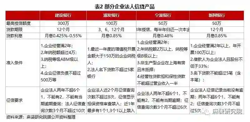 向微众银行申请小微企业贷款需要进行法人身份认证,并签订《个人征信授权书》及《保证担保合同》,授权微众银行查询法定代表人的个人信用记录及法定代表人对贷款承担连带责任保证。同时,贷款企业要签订《征信授权协议》和《数据使用授权书》,授权微众银行查询企业在人民银行的征信记录和企业的税务信息。其他部分银行的企业法人信贷产品如表2所示。