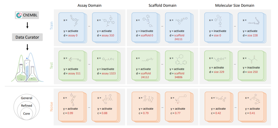 。5 种域标定方法(scaffold、assay、molecule size、protein、protein family)能够反映药物 AI 中真实的分布偏移场景;3 种噪声标定水平(core、refined、general)根据测量置信度,度量标准,截断噪声等来制定,能够锚定数据中不同的噪声水平。