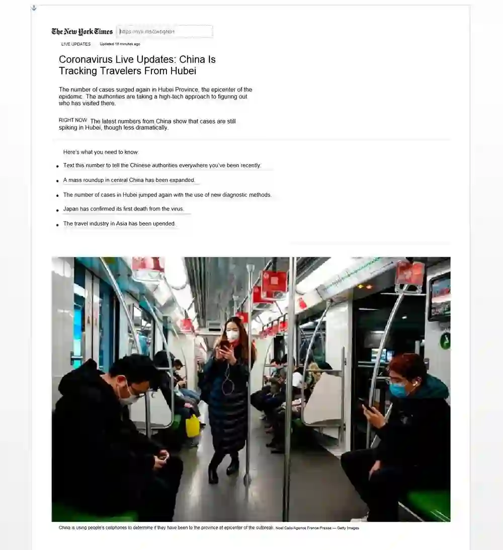 下面是诱饵文档,其标题是“冠状病毒实时更新:中国正在追踪来自湖北的旅行者”,它向受害者展示模仿自《纽约时报》的文章。