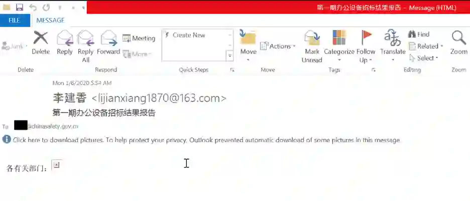 据 FireEye 披露,在 COVID-19 发生后,APT32 针对中国的第一起入侵事件发生于 2020 年 1 月 6 日。通过利用 lijianxiang1870@163[.]com 的发件人地址和第一期办公设备招标结果报告的邮件主题,APT32 向中国应急管理部发送了带嵌入式跟踪链接的电子邮件。