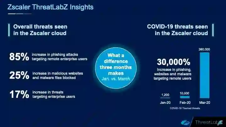 Zscaler 在博客中写道,“一月份,我们看到(和阻止)了 1200 起攻击,而三月份,我们观察到 380000 起。从一月以来,钓鱼、恶意网站和以远程用户为目标的恶意活动增长 30000%。”