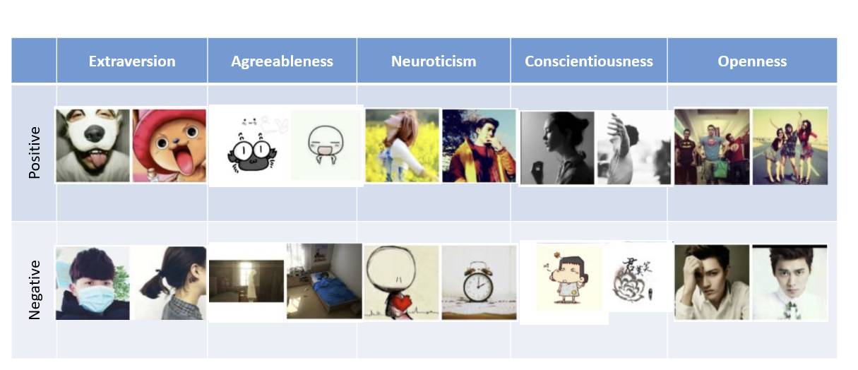 再来看用户的头像,我们发现头像和性格之间也有一定的联系,比如外向性高的人头像会有卡通,或者表情很夸张。外向性低的人,会用下面这些头像,但这只是一些典型的例子,并不是说所有人都用这个头像。这里面其实也可以用到很多人脸识别或者物体识别的技术。