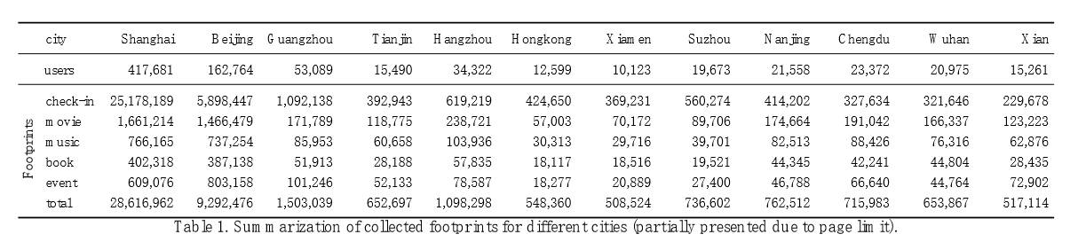 这个表展示了在不同城市的数据,因为用户填写了很多城市,有了这个数据集,就可以做很多研究。比如做位置预测,位置预测本身并不是一个新的问题。而我们关注的是分析用户,如果是游客或者是本地人,他们有什么样的区别,通过这个数据我们发现了不同,甚至还可以用这些不同来猜测一个用户是不是真正的本地人。因为在中国人口的迁徙是非常多的,这样一个迁徙所带来的人的行为变化,很多时候反应了一些社会问题,所以之前有很多媒体十分关注我们的这个研究,而这还可以做很多下一步的研究。