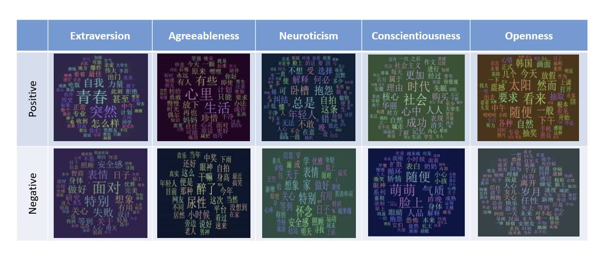 外向性高的人喜欢在微博里写青春、自我、突然,而外向性低的人会写面对、特别、失败、做好。我们可以发现他们用的词的确很不一样。