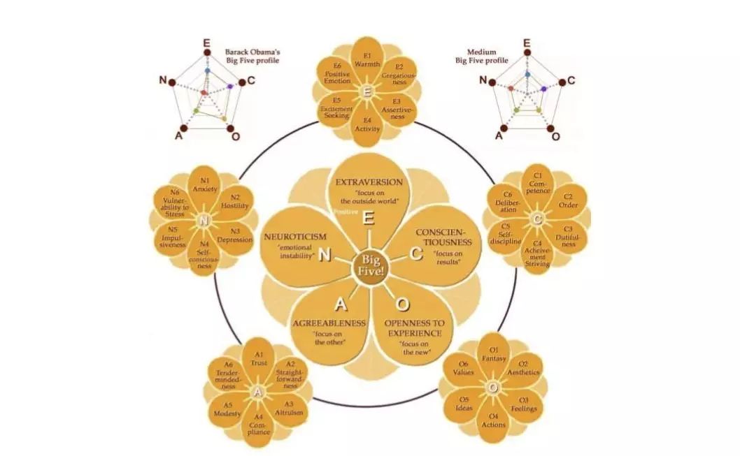通过查看词典,心理学家找到了4500个可以描述人性格的词,并在此基础上进一步缩减、归类,总结成五个维度,叫大五人格。