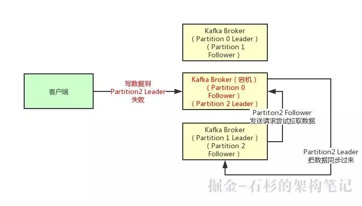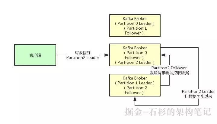 也就是说,如果有一个客户端往一个 Partition 写入数据,此时一般就是写入这个 Partition 的 Leader 副本。