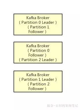 如上图所示,假设一个 Topic 拆分为了 3 个 Partition,分别是 Partition0,Partiton1,Partition2,此时每个 Partition 都有 2 个副本。