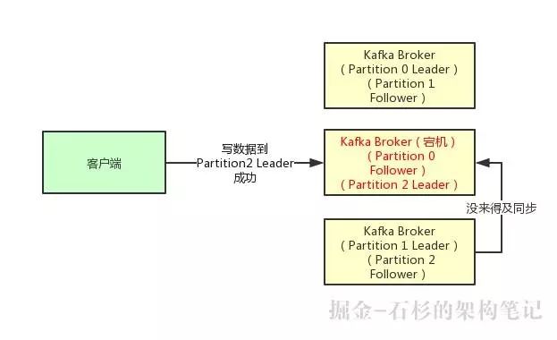 结果呢,Partition Leader 所在 Broker 就直接挂了,然后结果你的客户端还认为消息发送成功了,此时就会导致这条消息就丢失了。