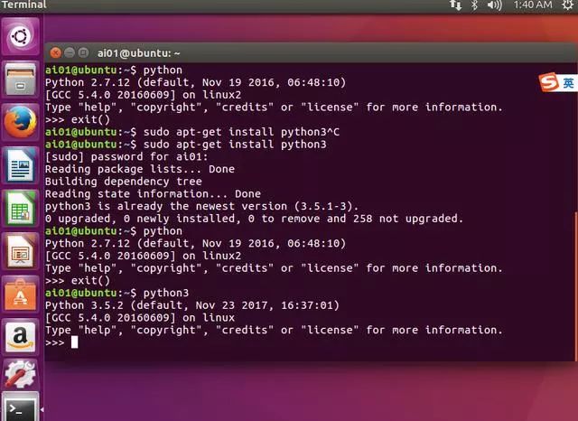 退出python(用exit()),输入sudo apt-get install python3,安装python3.已经提前安装过了,安装的是python3.5下面是显示的内容,安装成功。