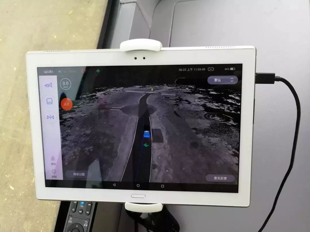 车上没有方向盘,原本驾驶员的位置,被一个类似平板电脑的设备代替。设备上展示着这台“阿波龙”的运行轨迹,并按照设定好的路线在两个站点之间运行。
