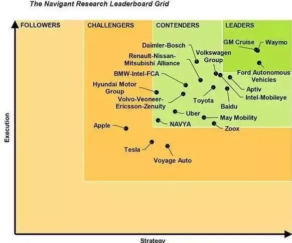 今年3月,研究机构Navigant Research发布了第三份年度自动驾驶汽车排行榜。榜单分三个等级,第一个等级囊括了全球自动驾驶的头部玩家,包括Waymo、通用(Cruise)以及福特(Ford Automomous);第二等级中,百度作为中国唯一一家企业上榜,苹果、特斯拉则名落第三等级。