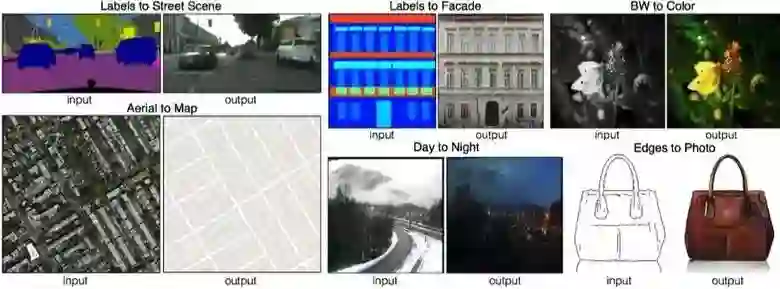 这是条件GAN的又一个出色表现的例子。在这个例子中,条件由整个图片决定。图像分割中的热门技术UNet被用来作为生成器的结构,新提出的PatchGAN分类器被用来作为鉴别器以防图像难以区分。(图片被分割为N小块,每一块的真假分别预测)