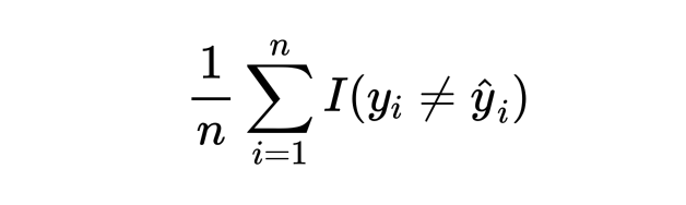 上文提到回归问题中利用 test MSE 来衡量模型好坏,对于分类问题,也有一个类似的衡量指标:误分类率 (error rate)。可写为以下形式: